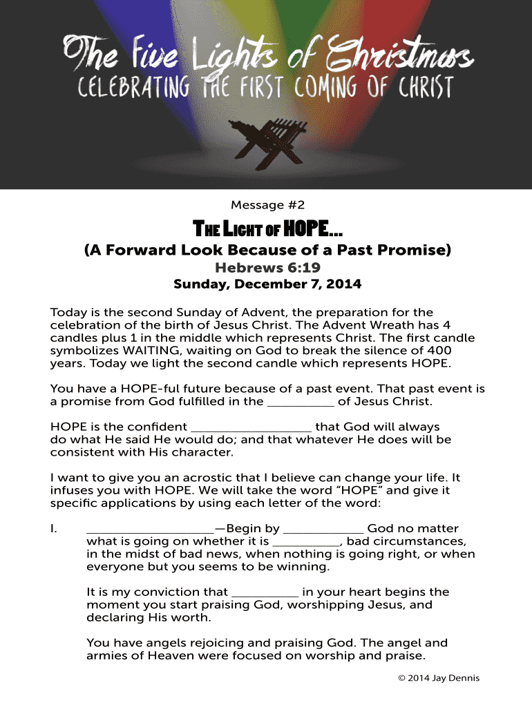 Message #2 The Light of HOPE... ×A Forward Look Because of a Past Promise) Hebrews 6:19 Sunday, December 7, 2014, Today is the second Sunday of Advent, the preparation for the celebration of the