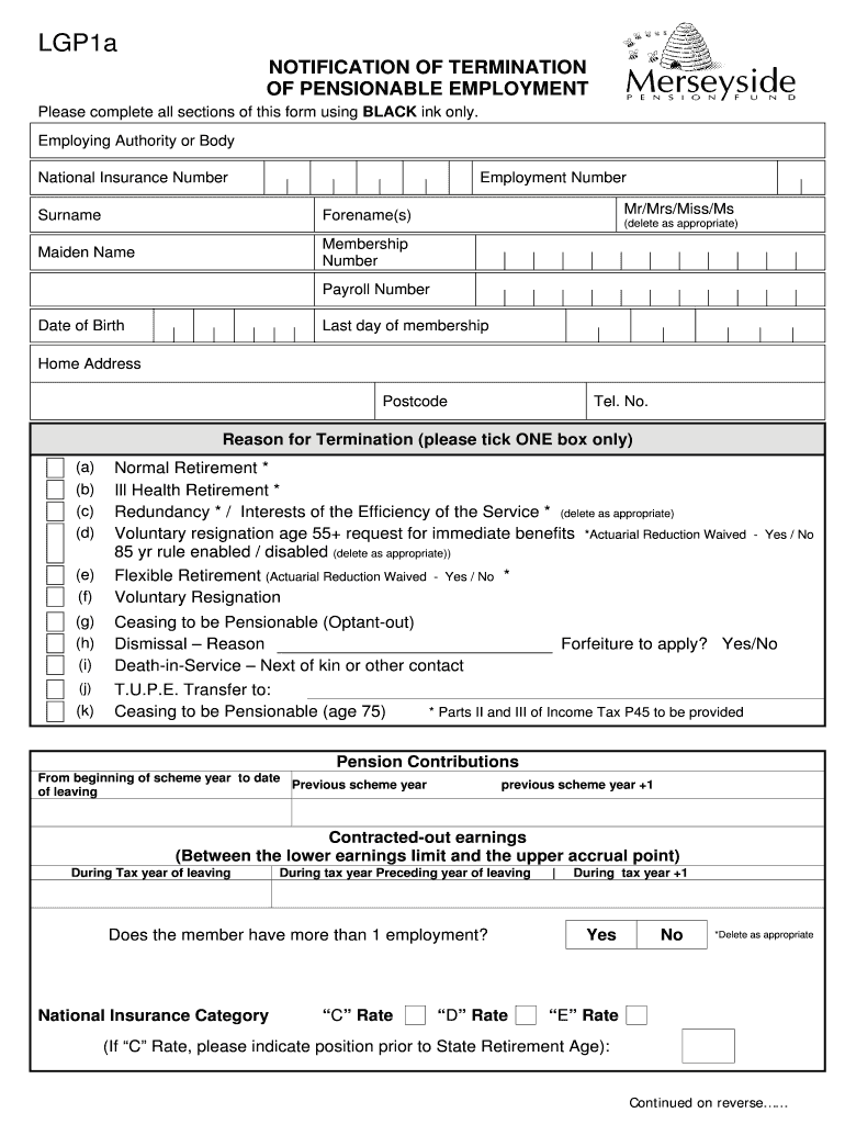 LGP1a NOTIFICATION OF TERMINATION OF PENSIONABLE EMPLOYMENT Please complete all sections of this form using BLACK ink only. Employing Authority or Body National Insurance Number Employment Number
