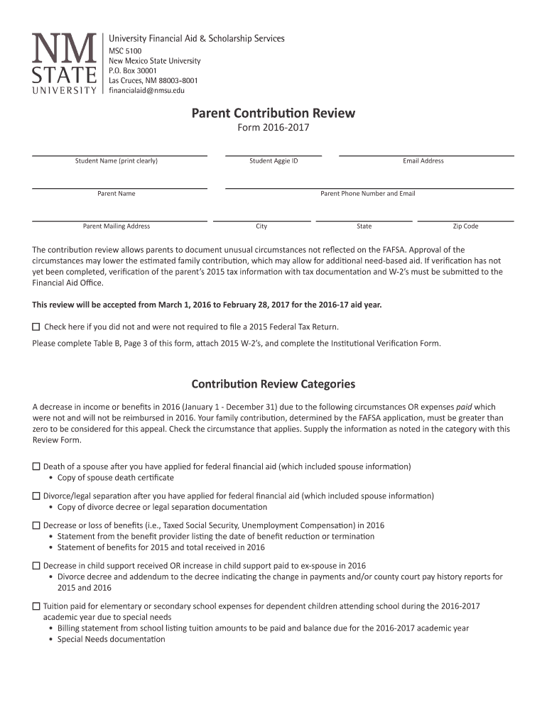 Parent Contribution Review Form 20162017 Student Name (print clearly) Student Aggie ID Parent Name Parent Mailing Address Email Address Parent Phone Number and Email City State Zip Code The contribution