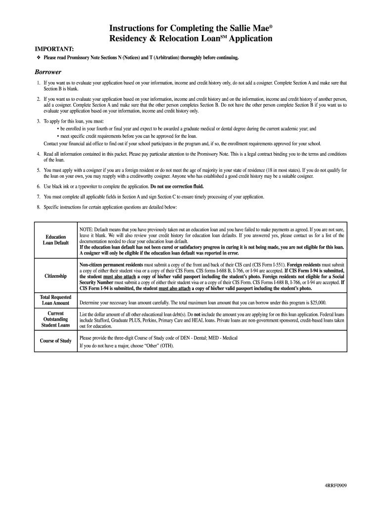 This document provides detailed instructions for completing the application for the Sallie Mae Residency & Relocation Loan, specifically targeted at borrowers and cosigners, outlining the necessary