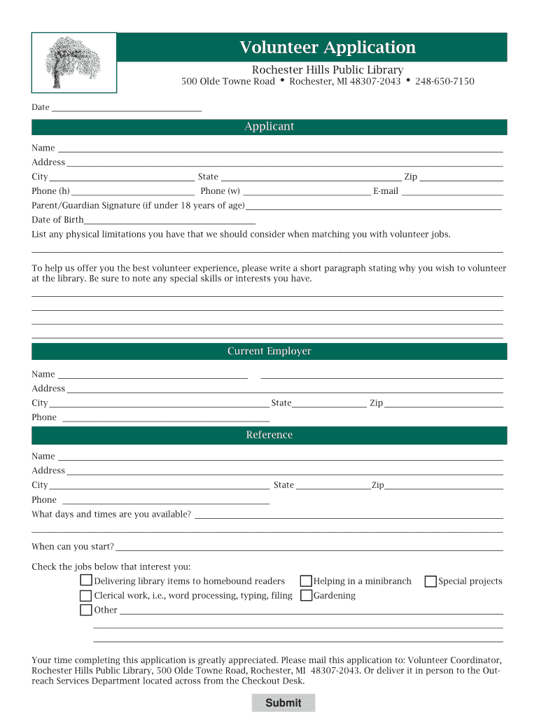 Volunteer Application Rochester Hills Public Library 500 Old Town Road Rochester, MI 483072043 2486507150 Date Applicant Name Address City State Zip Phone (h) Phone (w) Email Parent×Guardian Signature
