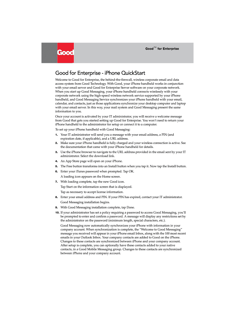 Good for Enterprise Good for Enterprise iPhone Quick-start Welcome to Good for Enterprise, the behindthefirewall, wireless corporate email and data access system from Good Technology. With Good, your