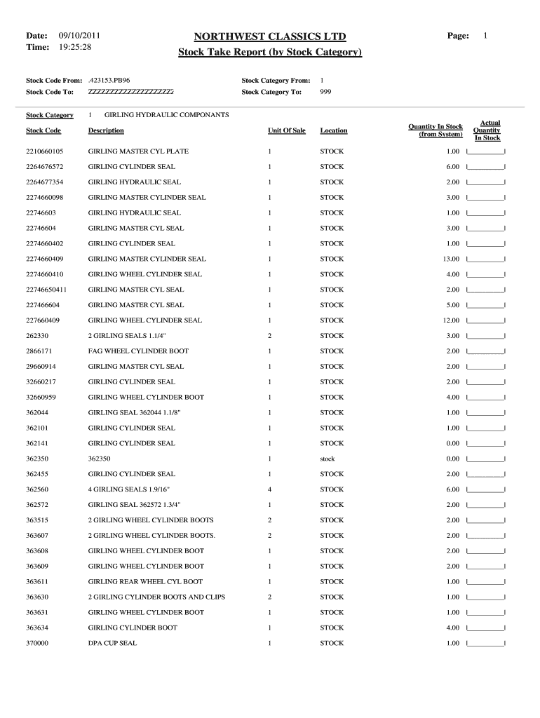 Date: Time: 09×10/2011 19:25:28 NORTHWEST CLASSICS LTD Stock Take Report (by Stock Category) Stock Code From: .423153.PB96 Stock Category From: 1 1 Stock Category To: Page: 999 Stock Code To: ZZZZZZZZZZZZZZZZZZZZZZZZZZZZZZ