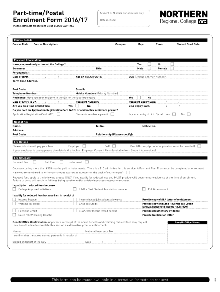 Get the free Part-timePostal Enrolment bFormb 201617 - Northern Regional College - nrc ac
