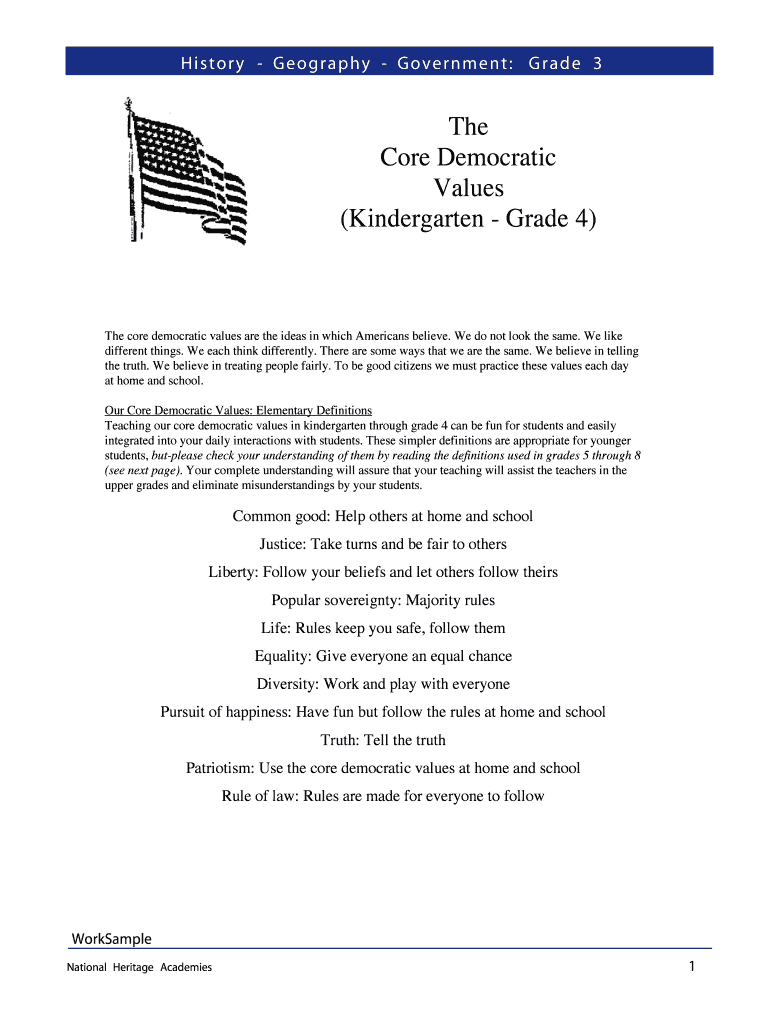 This document outlines the core democratic values for grades K-4, providing definitions and teaching strategies for elementary students, along with various lesson plans focused on the principles of