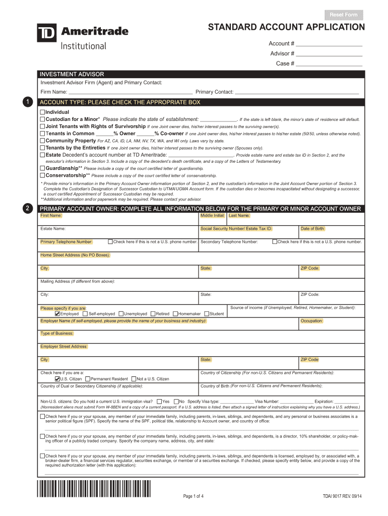 Reset Form STANDARD ACCOUNT APPLICATION Account # Advisor # Case # INVESTMENT ADVISOR Firm (Agent) and Primary Contact: Firm Name: Primary Contact: 1 ACCOUNT TYPE: PLEASE CHECK THE APPROPRIATE BOX
