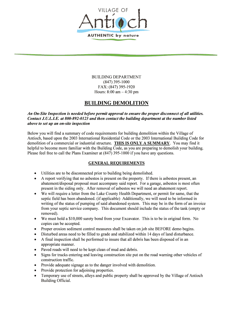 This document provides guidelines and requirements for obtaining a demolition permit in the Village of Antioch, including necessary inspections, submissions, and compliance expectations.