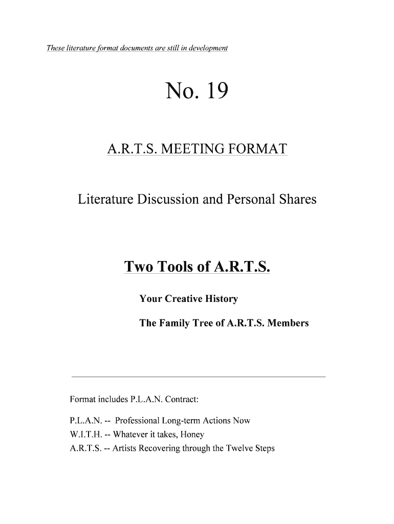 These literature format documents are still in development No. 19 A.R.T.S. MEETING FORMAT Literature Discussion and Personal Shares Two Tools of A.R.T.S. Your Creative History The Family Tree of A.R.T.S.