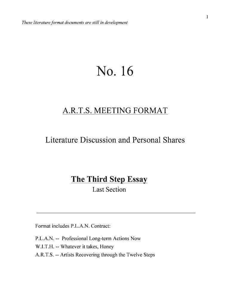 1 These literature format documents are still in development No. 16 A.R.T.S. MEETING FORMAT Literature Discussion and Personal Shares The Third Step Essay Last Section Format includes P.L.A.N. Contract: