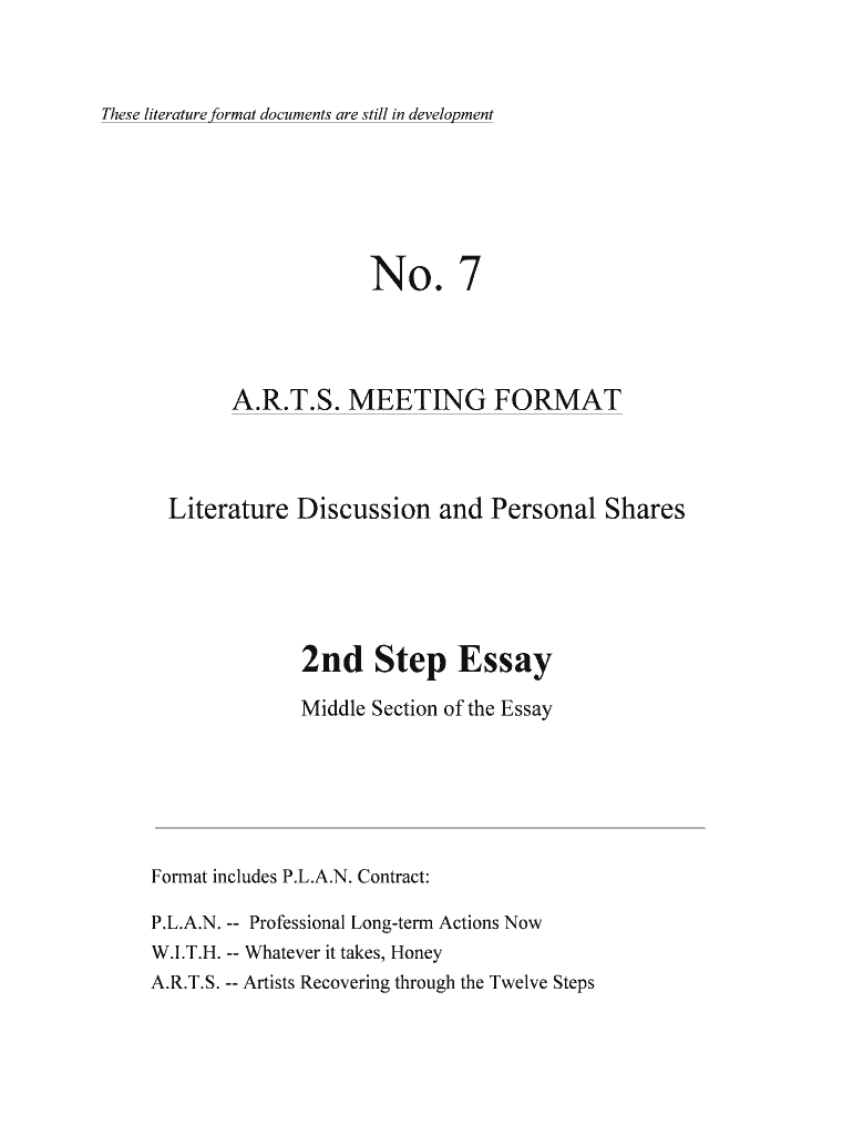 These literature format documents are still in development No. 7 A.R.T.S. MEETING FORMAT Literature Discussion and Personal Shares 2nd Step Essay Middle Section of the Essay Format includes P.L.A.N.