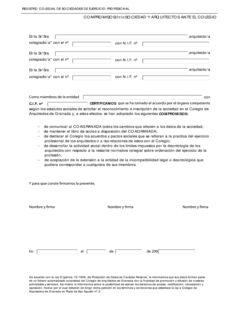 REGISTRY COLLEGIAL DE SOCIETIES DE JERICHO PROFESSIONAL COMPROMISOSdelaSOCIEDAD Y ARCHITECTS ANTE EL COLEGIO El×la Sr×SRA architect×a colegio×a* con el n con N.I.F. n architect×an El×la Sr×SRA