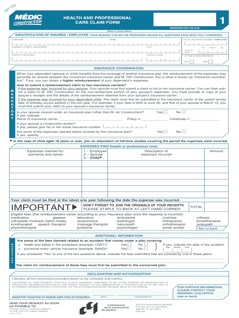 1 HEALTH AND PROFESSIONAL CARE CLAIM FORM RESERVED FOR THE CCQ (Write in block letters) IDENTIFICATION OF INSURED / EMPLOYEE YOUR REQUEST CAN NOT BE PROCESSED UNLESS ALL QUESTIONS HAVE BEEN FULLY