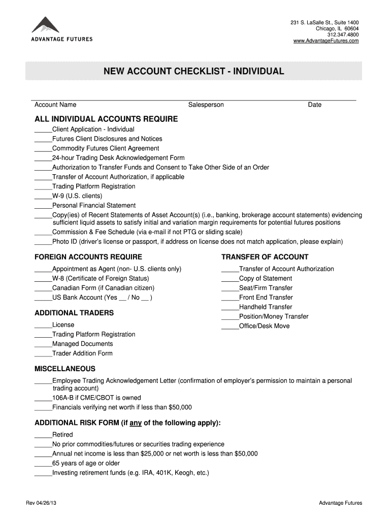 231 S. Basally St., Suite 1400 Chicago, IL 60604 312.347.4800 www.AdvantageFutures.com NEW ACCOUNT CHECKLIST INDIVIDUAL Account Name Salesperson Date ALL INDIVIDUAL ACCOUNTS REQUIRE Client Application