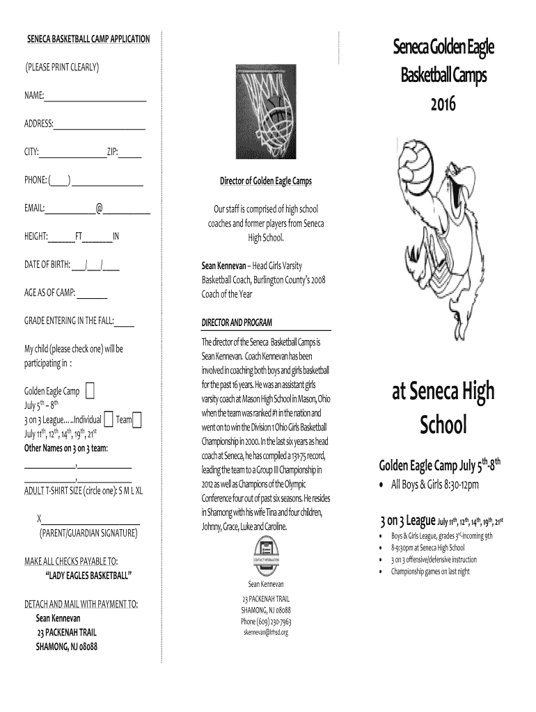 SENECA BASKETBALL CAMP APPLICATION Seneca Golden Eagle Basketball Camps 2016 (PLEASE PRINT CLEARLY) NAME: ADDRESS: CITY: ZIP: PHONE: () EMAIL: HEIGHT: FT IN DATE OF BIRTH: / / Director of Golden Eagle