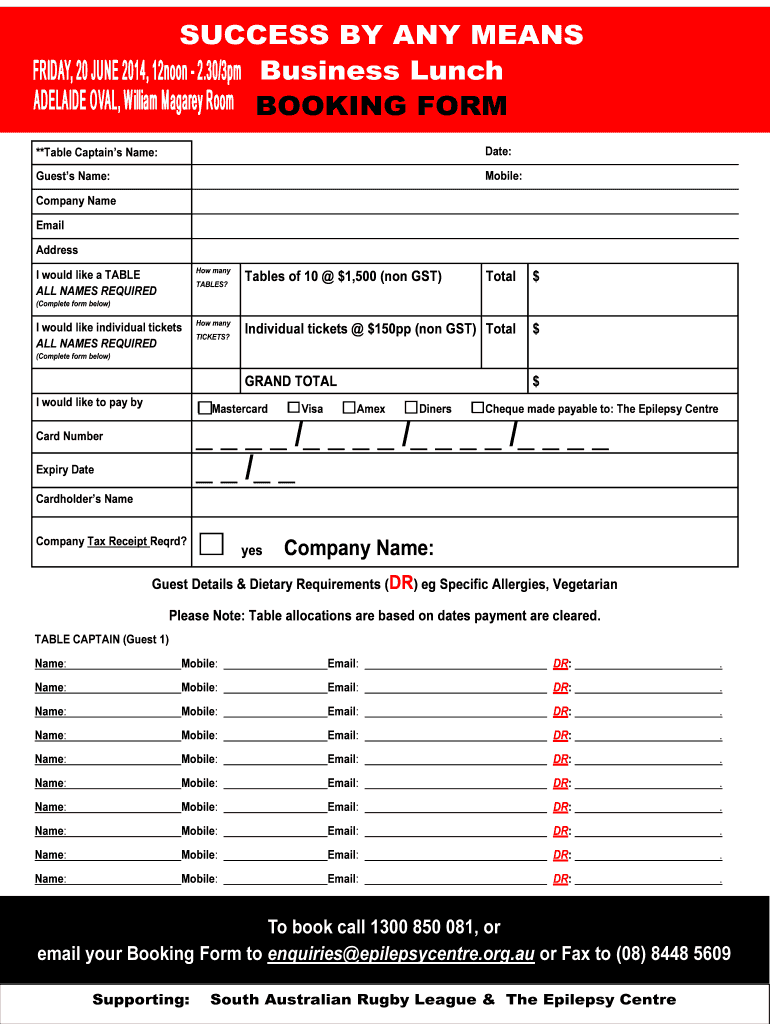SUCCESS BY ANY MEANS Business Lunch BOOKING FORM **Table Captains Name: Date: Guests Name: Mobile: Company Name Email Address How many TABLES? Total $ Individual tickets $150pp (non GST) Total $ GRAND
