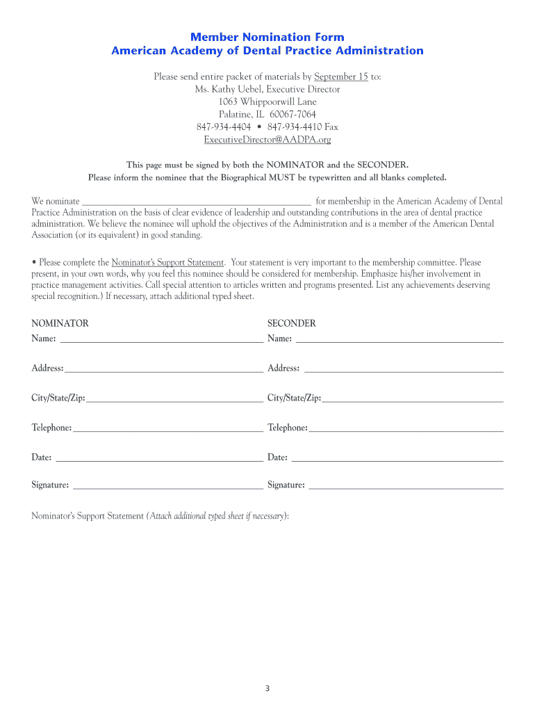 Membership Nomination Packet The American Academy of Dental Practice Administration TABLE OF CONTENTS Guidelines for Sponsorship. . . . . . . . . . . . . . . . . 2 Member Nomination Form. . . . .