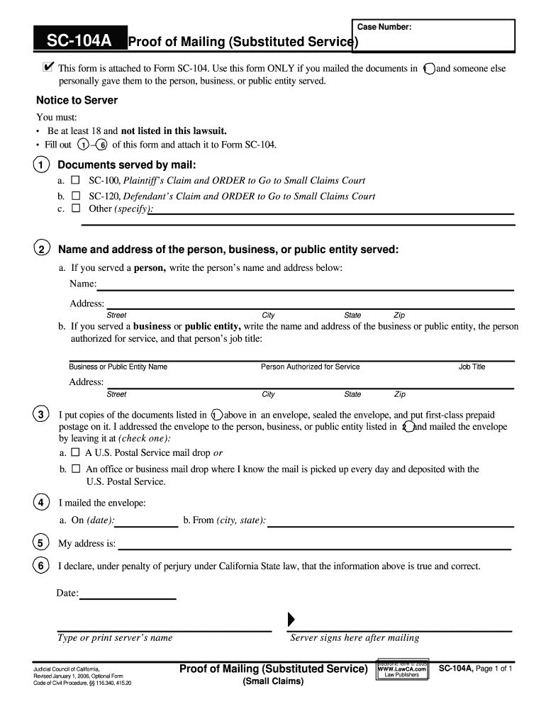 Case Number: SC-104A Proof of Mailing (Substituted Service) This form is attached to Form SC-104. Use this form ONLY if you mailed the documents in personally gave them to the person, business, or