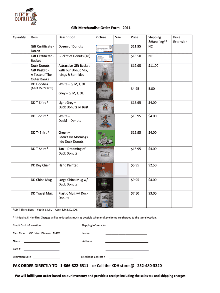 Gift Merchandise Order Form 2011 QuantityItemDescriptionGift Certificate A Dozen Gift Certificate Bucket Duck Donuts Gift Basket A Taste of The Outer Banks DD HoodiesDozen of Donuts×11.95Shipping