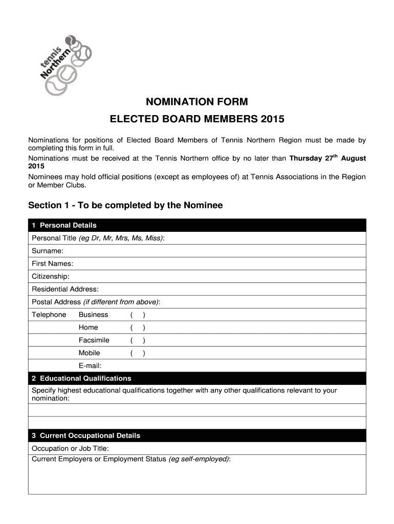 Get the free NOMINATION FORM ELECTED BOARD MEMBERS 2015 - Tennis Northern - tennisnorthern