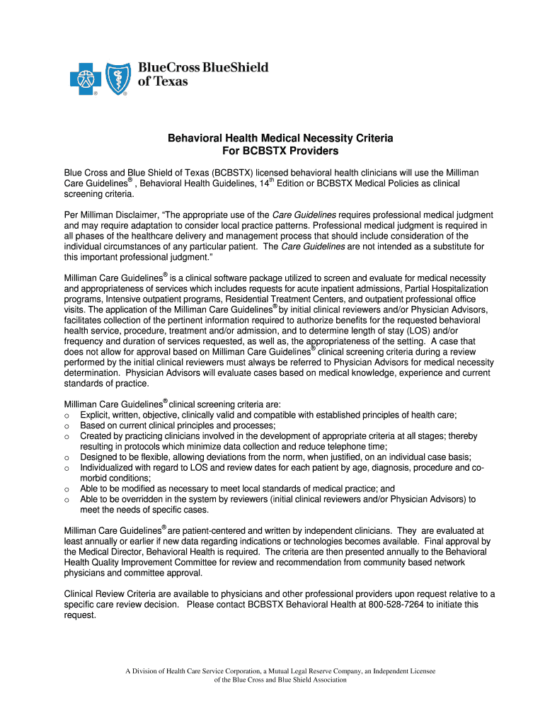 This document outlines the clinical criteria for determining the medical necessity of behavioral health services for Blue Cross and Blue Shield of Texas (BCBSTX) providers, utilizing Milliman Care
