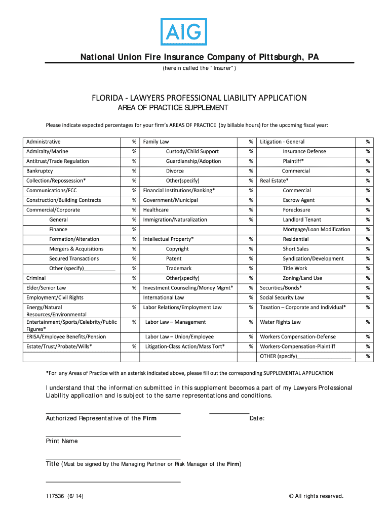 National Union Fire Insurance Company of Pittsburgh, PA (herein called the Insurer) FLORIDA LAWYERS PROFESSIONAL LIABILITY APPLICATION AREA OF PRACTICE SUPPLEMENT Please indicate expected percentages