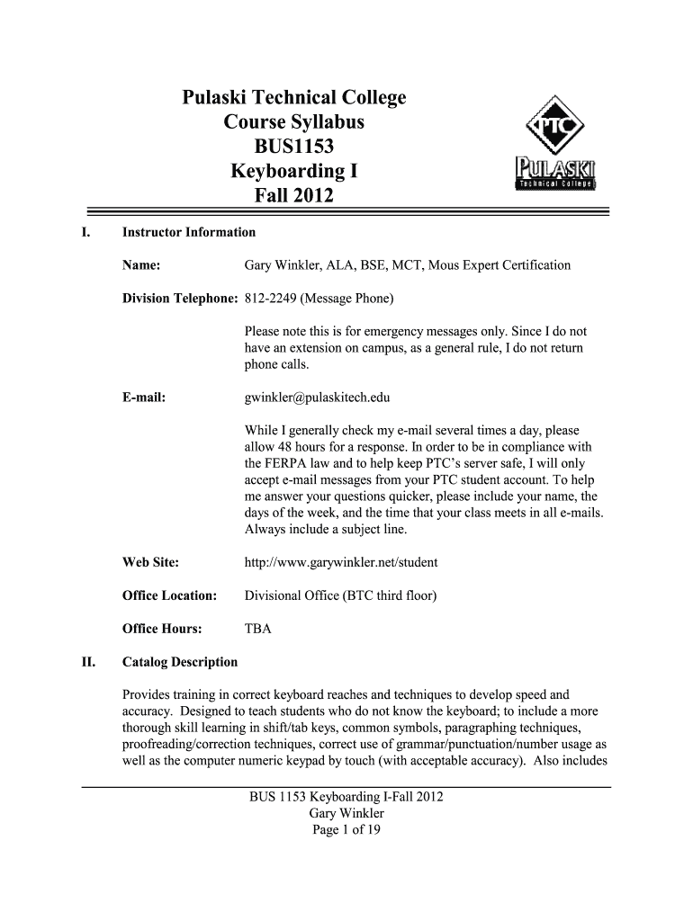 This document serves as the course syllabus for BUS1153 Keyboarding I at Pulaski Technical College, outlining instructor information, course objectives, attendance policies, classroom policies, grading