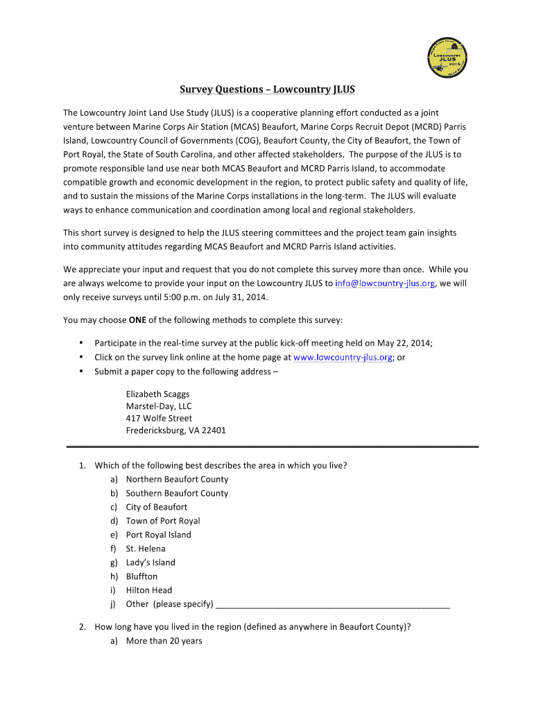 Get the free Survey Questions Lowcountry JLUS - The Lowcountry Joint Land ... - lowcountry-jlus