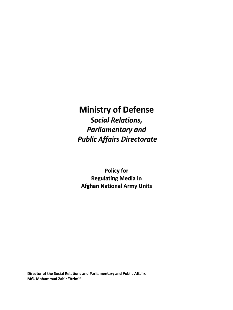 Ministry of Defense Social Relations, Parliamentary and Public Affairs Directorate Policy for Regulating Media in Afghan National Army Units Director of the Social Relations and Parliamentary and