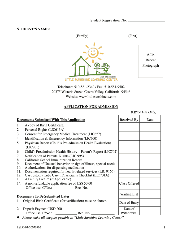 Student Registration. No: STUDENTS NAME: (Family) (First) Affix Recent Photograph Telephone: 5105812340 / Fax: 5105819502 20375 Wisteria Street, Castro Valley, California, 94546 Website: www.littlesunshinelc.com