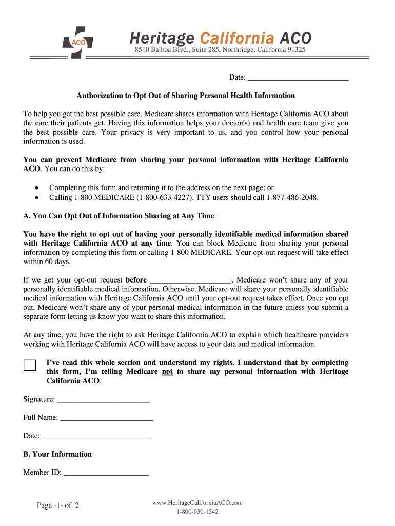 Heritage California ACO 8510 Balboa Blvd., Suite 285, Northridge, California 91325 Date: Authorization to Opt Out of Sharing Personal Health Information To help you get the best possible care, Medicare