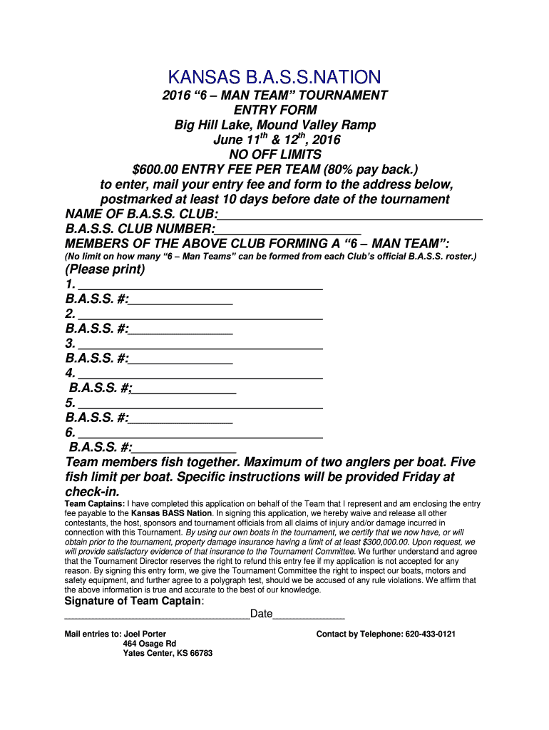Get the free NATION 2016 6 MAN TEAM TOURNAMENT ENTRY FORM Big Hill Lake, Mound Valley Ramp June 1...