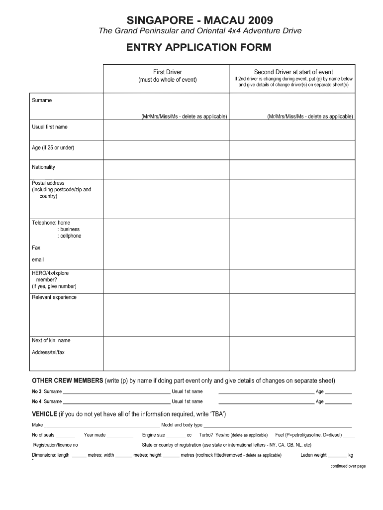 SINGAPOREMACAU2009 TheGrandPeninsularandOriental4x4AdventureDrive ENTRYAPPLICATIONFORM FirstDriver SecondDriveratstartofevent (mustdowholeofevent) If2nddriverischangingduringevent,put×p)bynamebelow