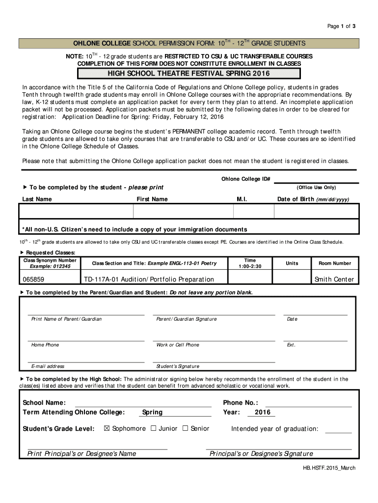 Get the free BHSb Theatre Festival 2016 Sophomores School Permission bFormb bb - ohlone