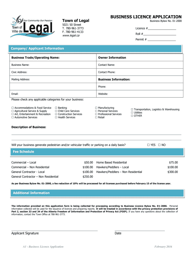 BUSINESS License APPLICATION Town of Legal Business Bylaw No. 01-2000 5021 50 Street T. 780-961-3773 F. 780-961-4133 License # Roll # www.legal.ca Permit # Company/ Applicant Information Business