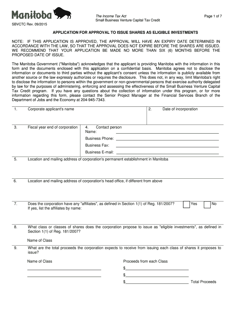 This document serves as an application for the approval to issue shares deemed as eligible investments under the Small Business Venture Capital Tax Credit program in Manitoba. It includes information
