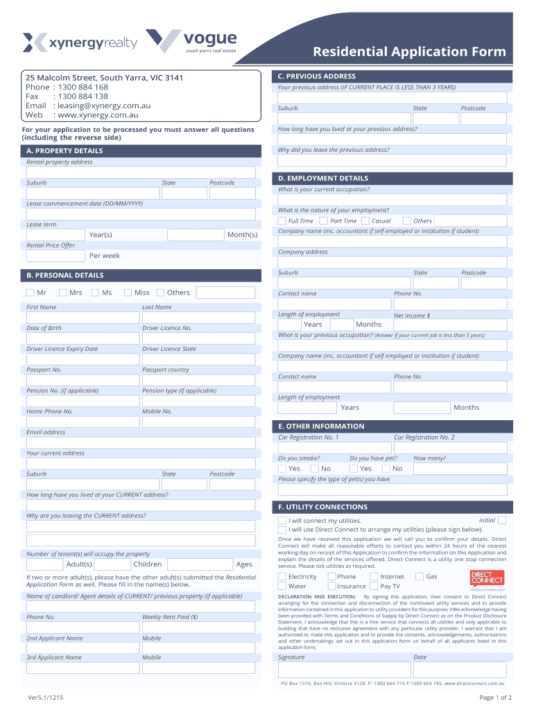 Residential Application Form C. PREVIOUS ADDRESS 25 Malcolm Street, South Area, VIC 3141 Phone : 1300 884 168 Fax : 1300 884 138 Email : leasing xynergy.com.AU Web : www.xynergy.com.au Your previous