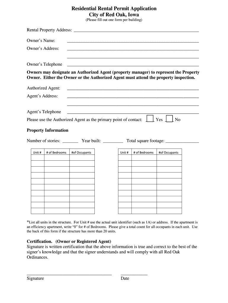 Residential Rental Permit Application City of Red Oak, Iowa (Please fill out one form per building) Rental Property Address: Owners Name: Owners Address: Owners Telephone Owners may designate an Authorized