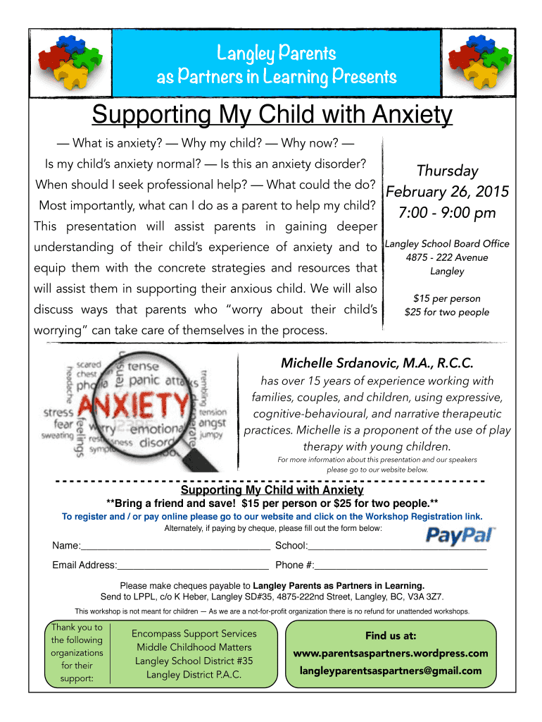 Langley Parents as Partners in Learning Presents Supporting My Child with Anxiety ! ! ! What is anxiety? Why my child? Why now? Is my children anxiety normal? Is this an anxiety disorder? Thursday,