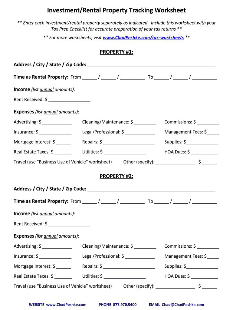 Property owners or investors who own rental properties are required to file the investment rental property tracking worksheet.