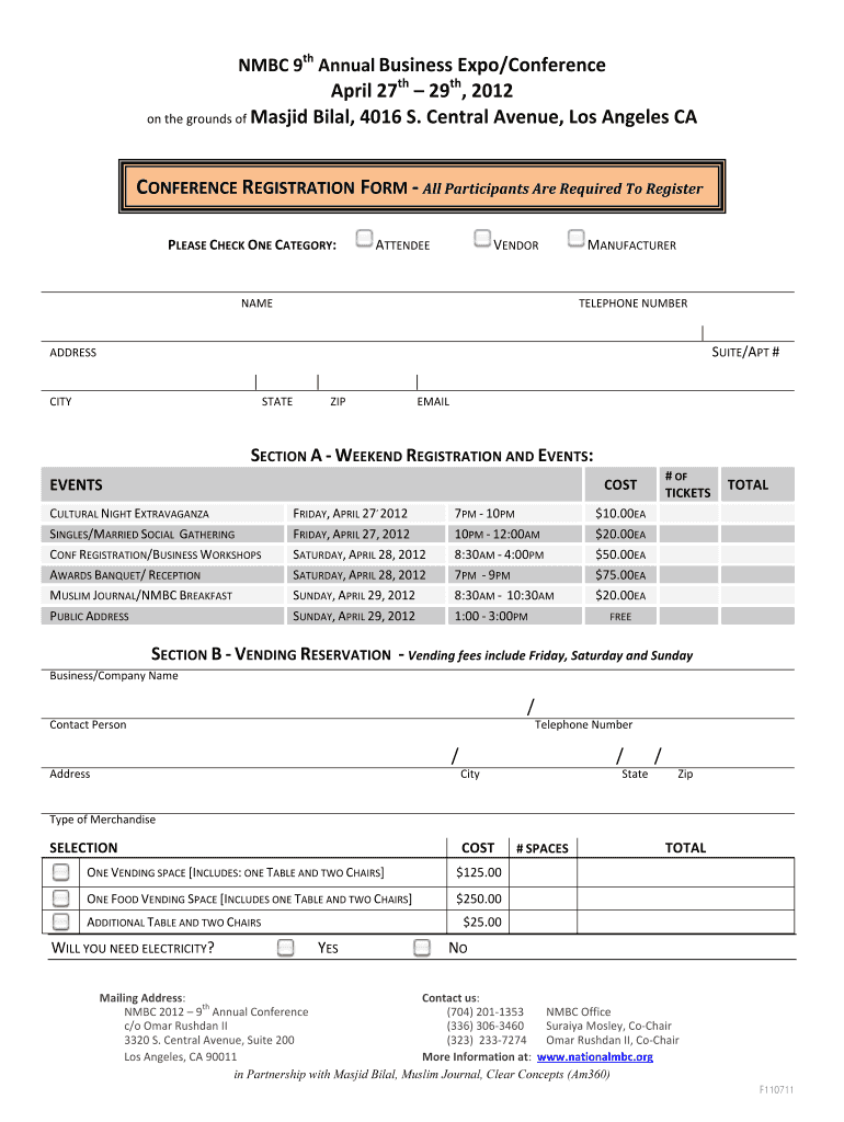 MBC 9th Annual Business Expo×Conference April 27th 29th, 2012 on the grounds of Masjid Bilal, 4016 S. Central Avenue, Los Angeles CA CONFERENCE REGISTRATION FORM All Participants Are Required To