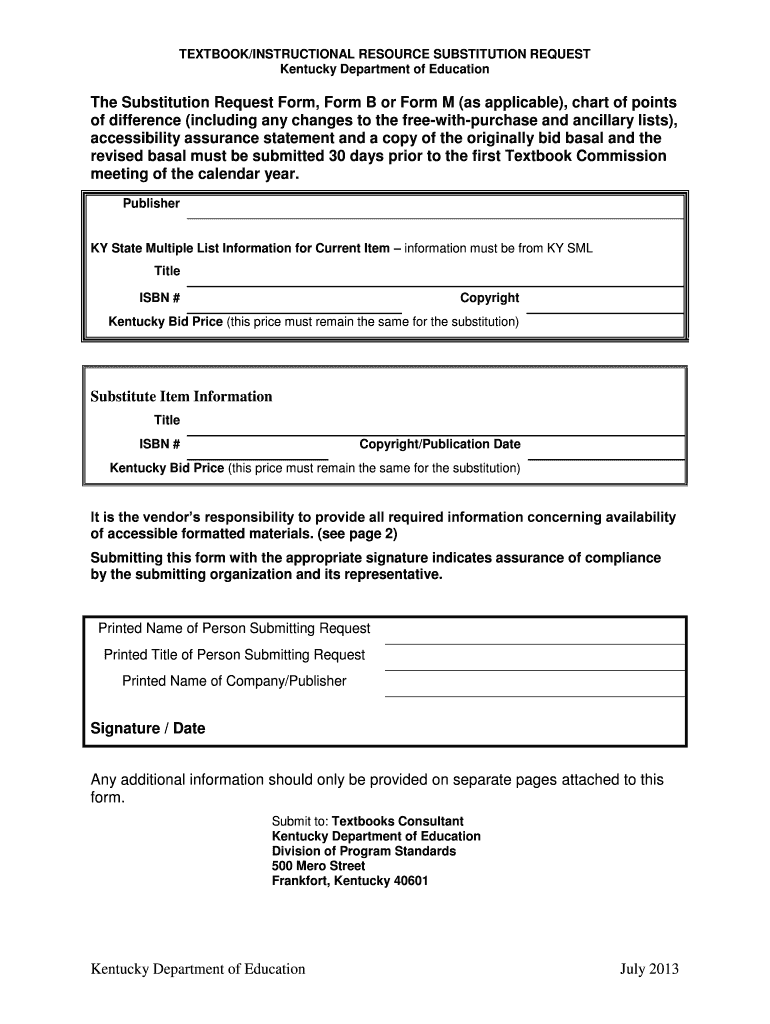 TEXTBOOK×INSTRUCTIONAL RESOURCE SUBSTITUTION REQUEST Kentucky Department of Education The Substitution Request Form, Form B or Form M (as applicable×, chart of points of difference (including any