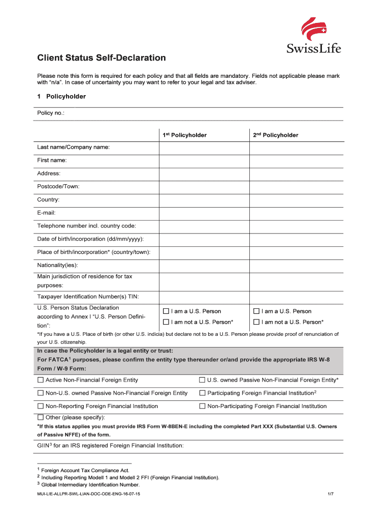 Client Status SelfDeclaration Please note this form is required for each policy and that all fields are mandatory. Fields not applicable please mark with n×a. In case of uncertainty you may want