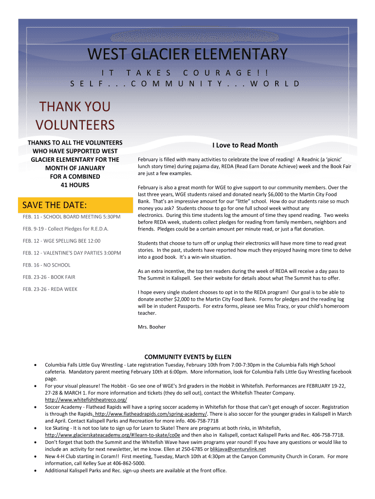 WESTGLACIERELEMENTARY I T T A K E S C O U R A G E ! ! S E L F. C O M M U N I T Y. W O R L D THANK-YOU VOLUNTEERS THANKSTOALLTHEVOLUNTEERS WHOHAVESUPPORTEDWEST GLACIERELEMENTARYFORTHE MONTHOFJANUARY