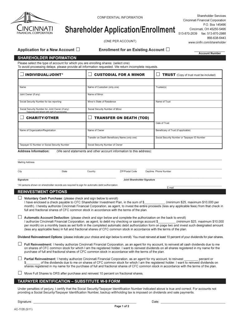 This document is a shareholder application/enrollment form for Cincinnati Financial Corporation, allowing individuals to apply for a new account or enroll in an existing account. It includes options