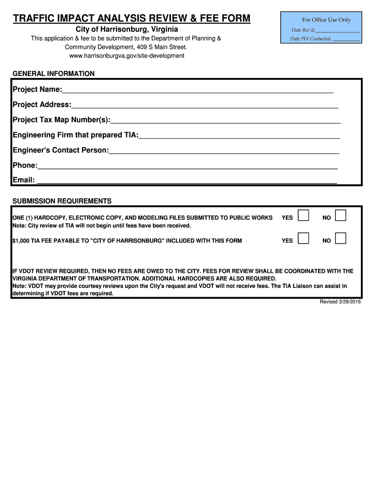TRAFFIC IMPACT ANALYSIS REVIEW & FEE FORM For Office Use Only City of Harrisonburg, Virginia Date Recd: This application & fee to be submitted to the Department of Planning & Community Development,