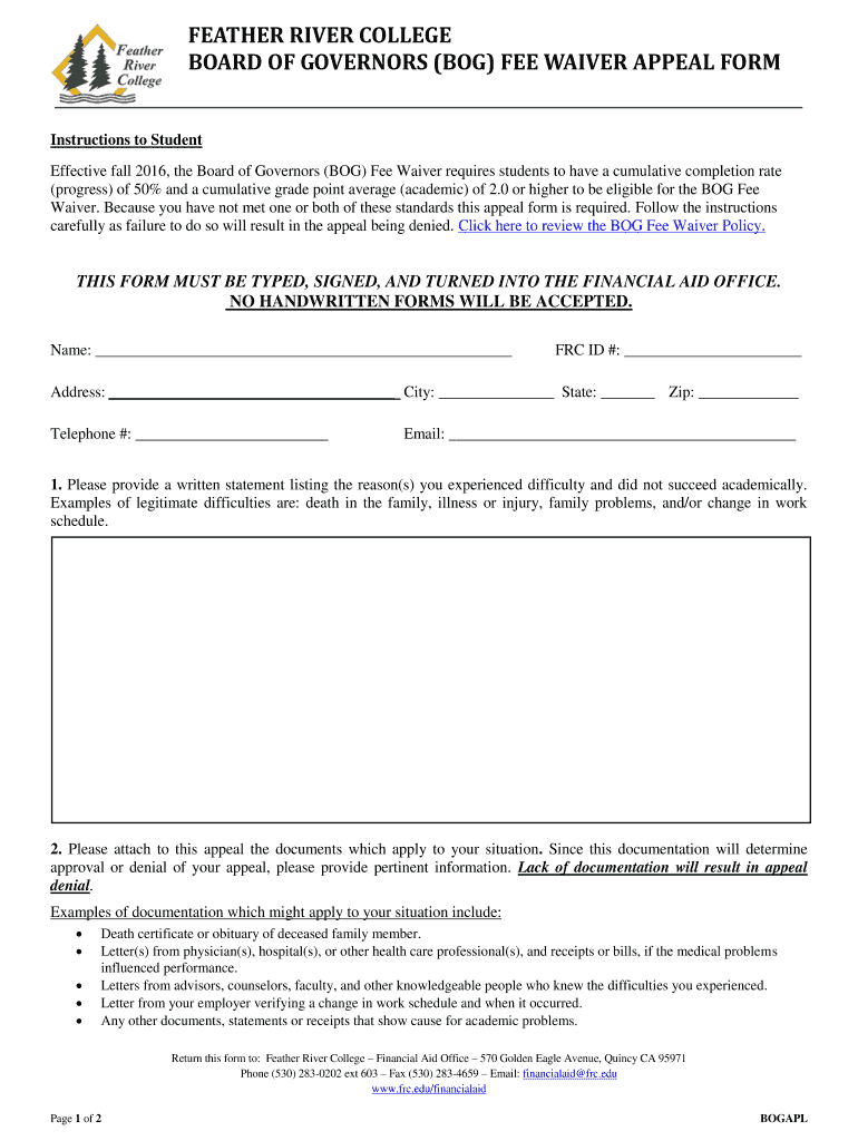 FEATHER RIVER COLLEGE BOARD OF GOVERNORS (BOG) FEE WAIVER APPEAL FORM Instructions to Student Effective fall 2016, the Board of Governors (BOG) Fee Waiver requires students to have a cumulative completion