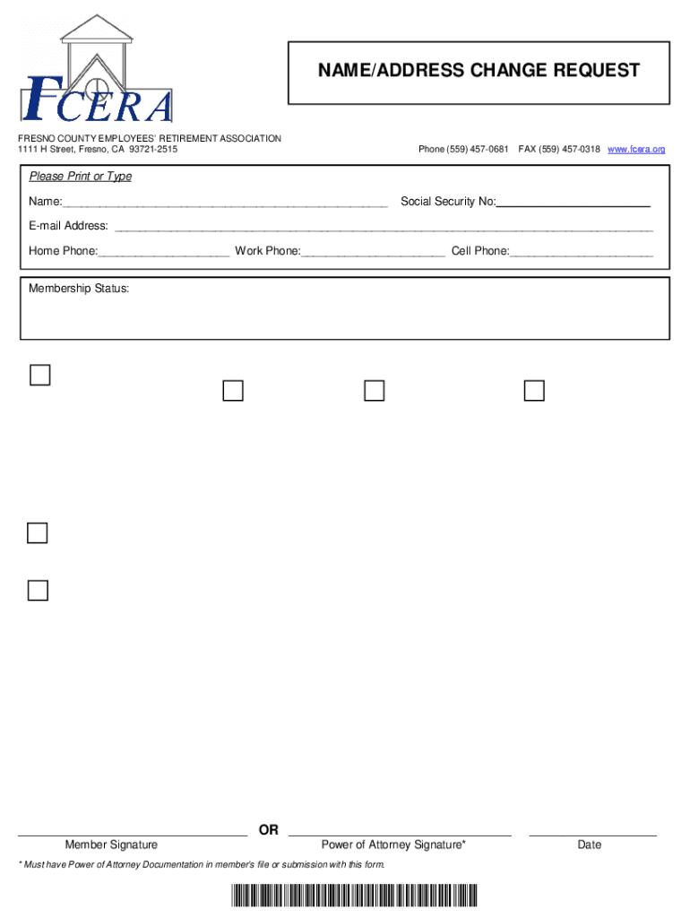 This document is used by members of the Fresno County Employees’ Retirement Association to request a change of name or address. It outlines the necessary information and documentation required for