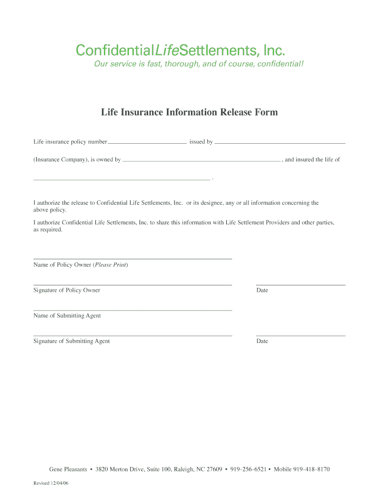 Life insurance policy number issued by (Insurance Company×, is owned by, and insured the life of. I authorize the release to Confidential Life Settlements, Inc. or ...