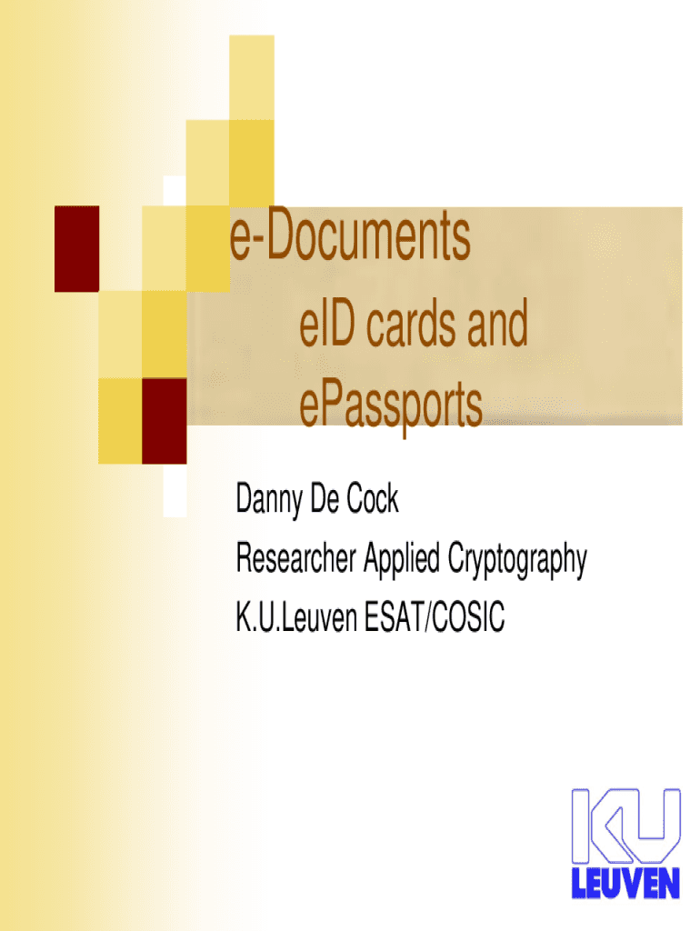 This document discusses the applications of eID cards and ePassports, detailing their identification, authentication functions, and security measures, including the importance of biometric data and