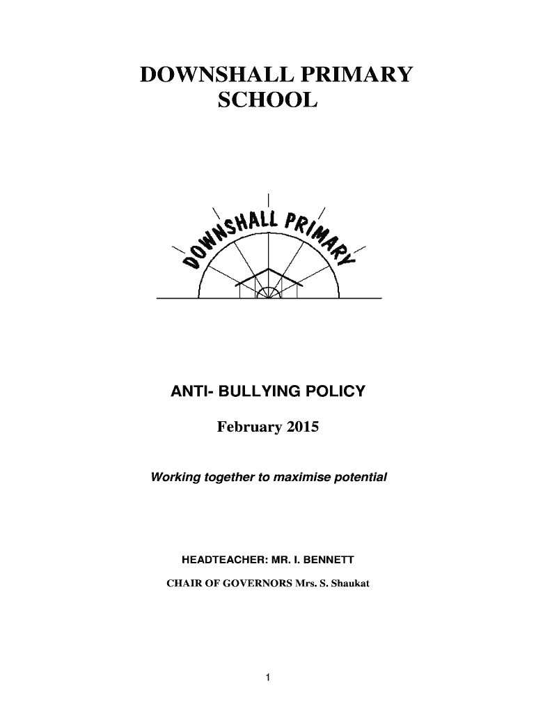 DOWNFALL PRIMARY SCHOOL ANTI BULLYING POLICY February 2015 Working together to maximize potential HEADTEACHER: MR. I. BENNETT CHAIR OF GOVERNORS Mrs. S. Shaka 1 Vision Down shall Primary school is